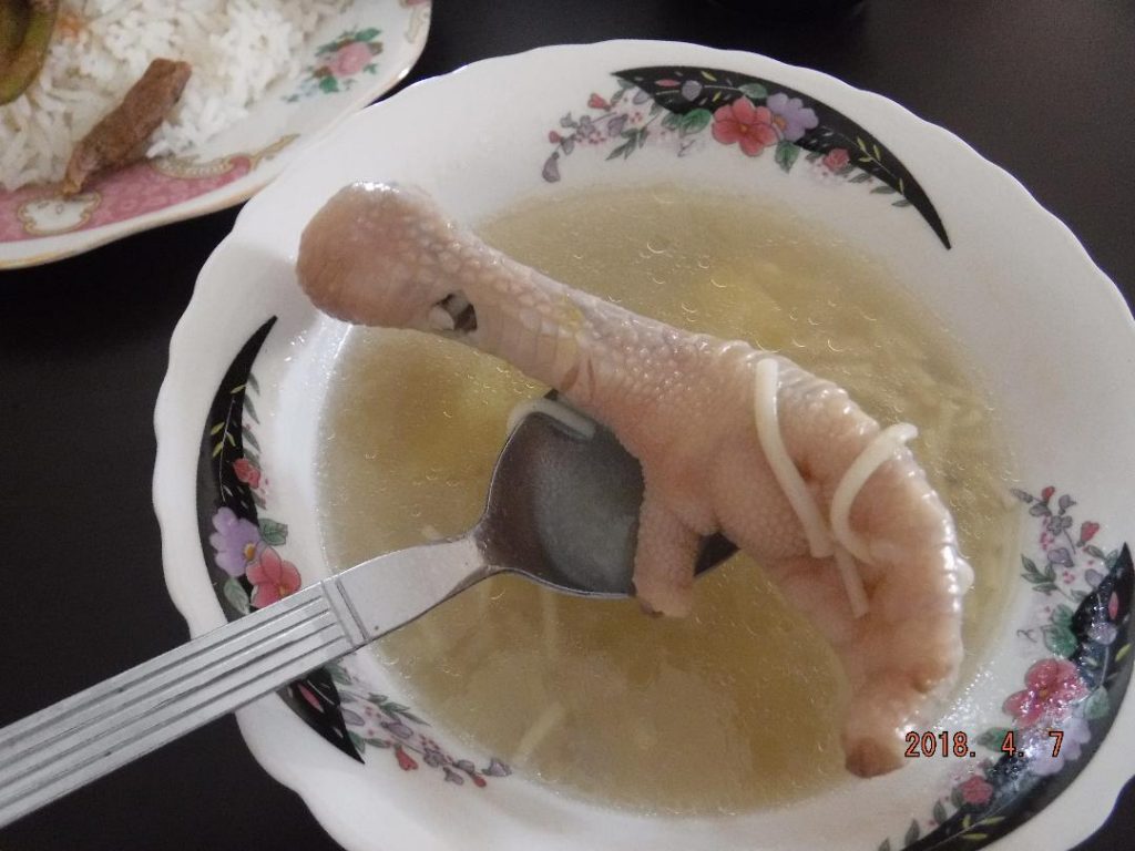 We were over at the bishops house (and the sister says she doesn´t cook well but she really does cook well) And she gave us our soups and she told Elder Day, you have the honor to eat the chicken foot! And so my companion looked at it was like, I am not able to eat this. Sorry, But I went, Hey I love the Pata de pollo. And so, I ate it, or more of gnawed on it because it is really hard and messy to eat. Super strange but cooked on a grill is more strange. So yummy!
